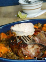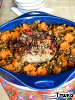 Затем уточка достала мясо из духовки (при этом духовка осталась включенной), сняла фольгу, переложила овощи с чечевицей к мясу, влила 3 ст.л. горячей воды и вновь отправила в духовку, уже без фольги на 40-45 минут, периодически перемешивая чечевицу.