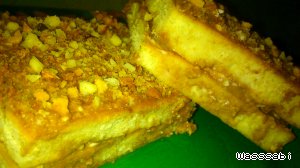 Накрыть смазанный корж вторым, хорошенько прижать, так же смазать обильно кремом, посыпать орешками и готовой заранее крошкой-посыпкой из коржа.