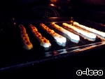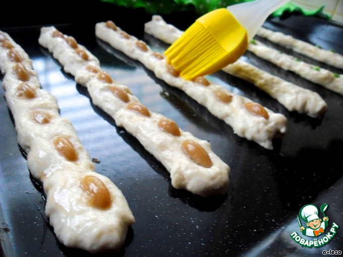Уложить на противень (смазывать не нужно, так как сама "палочка" уже промаслена) и предварительно отвареную фасоль, примерно на одинаковом растоянии, воткнуть ребром в "палочку". -