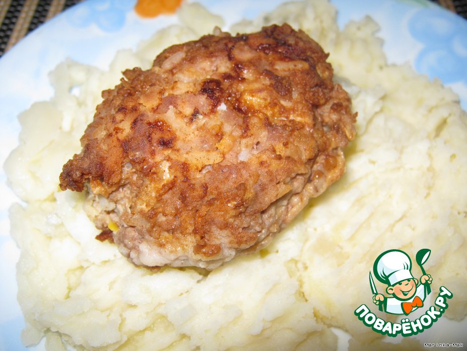 Из получившейся смеси сформировать большие котлеты. Обхлопать со всех сторон, чтобы они не развалились при жарке. Котлеты обвалять в сухарях или муке и обжарить на сильном огне. Они не должны прожариться, а только схватиться сверху румяной корочкой.