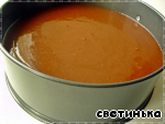 Выложите кусочки на нижний корж и разровняйте. Поставьте торт в холодильник.