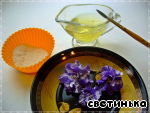 Для украшения цветов используйте белок и сахарную пудру. Фиалки смажьте белком с помощью кисточки и присыпьте сахарной пудрой. Оставьте до полного высыхания. Цветы являются частью декора.