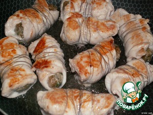 Обжаривать готовые рулетики на растительном масле на сильном огне при закрытой крышке.