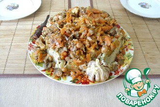 По истечению времени, открываем крышку сотейника. В середину массы кладем головку чеснока и равномерно засыпаем преждевременно промытым рисом. Заливаем горячей водой на 1,5 см. от риса и делаем огонь на всю. Далее, ждём, пока выкипит вся вода.