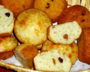 А здесь я использовала 200 г. сладкого творога с изюмом. Поставила формы с тестом в разогретую духовку на 25 минут при температуре 200 градусов.