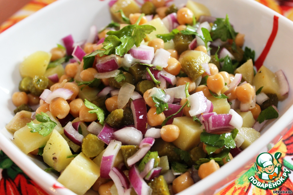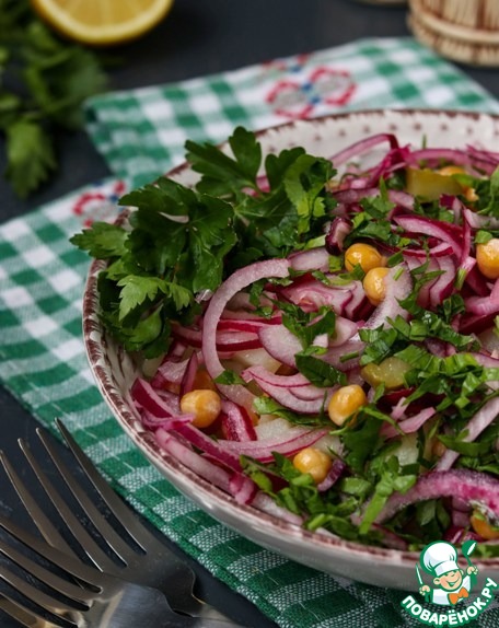 Выложить картофель, на него лук, затем нут. Посыпать зеленью петрушки. Подавать теплым! Приятного аппетита!!!
