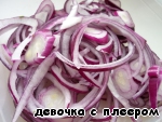 Луковицу нарезать кольцами, залить кипятком, оставить на 5 минут. Воду слить, приправить солью, перцем, яблочным уксусом и оливковым маслом.