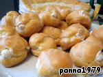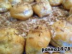 Перекладываем круг из слоеного теста на смазанный маслом противень. Заварное тесто перекладываем в кондитерский мешок или шприц. Если таковых не имеется, то можно использовать обычный плотный пакет со срезанным уголком. Выдавливаем тесто на нашу основу из слоеного теста по кругу в виде спирали. Из остального теста формируем на отдельном противне шарики - этот этап можно выполнить и чайной ложкой.