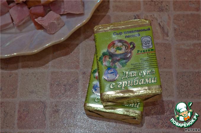 В кастрюльку налить 200 мл воды. Поставить на огонь, чтобы закипела. Плавленый сырок (у меня с грибами, для супа) порезать кубиками и расплавить в воде, чтобы получился соус.