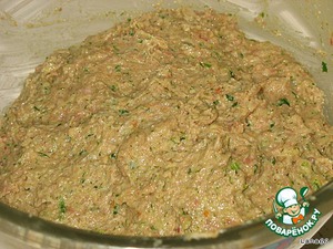 куриный фарш через мясорубку (я всегда покупной фарш пропускаю через мясорубку), далее лук,чеснок, вымоченный хлеб, зелень. Посолить и добавить соль и приправу. -