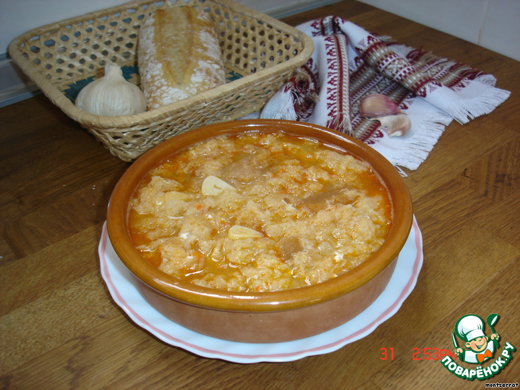 Sopa de pan con ajo В далекие 80 -е годы, партия в очередной раз объяснила советскому народу, почему он, народ, живет плохо. Оказывается потому, что выбрасывают много черствого хлеба. Технологов общественного питания обязали разработать рецепты блюд с черствым хлебом и включать их в меню своих предприятий. Тогда я не знала, что в далекой Испании народ тоже живет плохо, хотя хлеб там никогда не выбрасывали, а готовили из него хлебный суп с чесноком. С точки зрения современных диетологов, хлебный суп нельзя назвать слишком полезным, нет витаминов, но зато в холодные осенние вечера супчик может пригодиться. Он вкусный и сытный, да и черствый хлеб не придется выбрасывать.