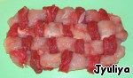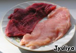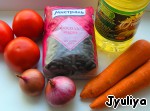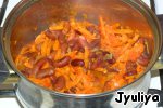 Рецепт: Фасоль замочить на 4 часа, отварить. Добавить обжаренные морковь и лук + томат. Все потушить. Куски курицы и телятины нарезать на полоски, сплести "одеяло". Завернуть фасоль в мясное одеяло.