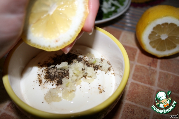 Баба любимую чашку взяла, решила в ней соус сама сделать. Йогурт вылила, перец черный в него добавила, чеснок (2 зуб.) выдавила и из лимона сок. Перемешала и в погреб убрала.