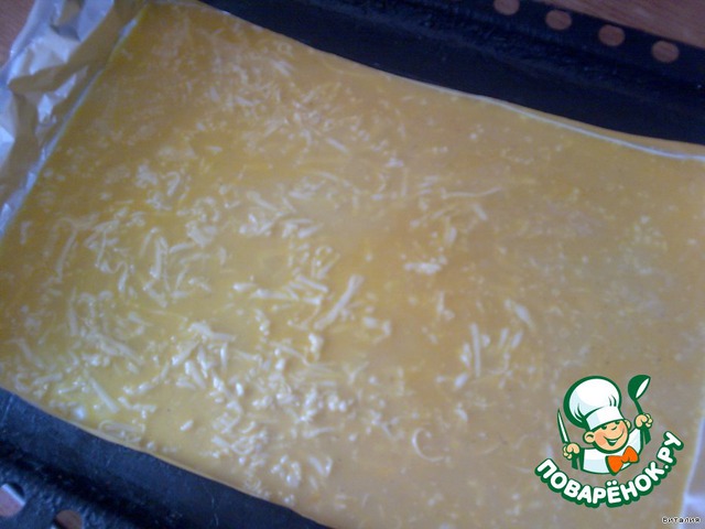 • Противень застелить фольгой, сделать бортики и вылить в нее смесь. Выпекать в духовке 10 мин.