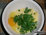 Для начинки нужно потереть сыр на крупной терке, добавить одно яйцо, нарубленную зелень петрушки. Хорошо размешать.