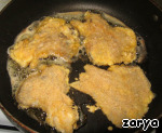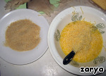 Готовим кляр: яйца взбить с молоком или сметаной, добавить сыр, тертый на мелкой терке. Кляр получается достаточно густой. Если любите более жидкий - используйте 1 яйцо и больше молока/сметаны. Отдельно насыпать панировочные сухари или муку.