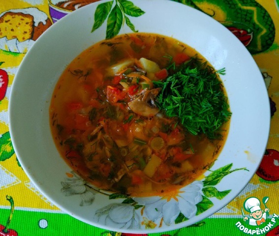 Совершенно случайно наткнулась на рецепт в интернете и пролистала, т. к. рецепт без картинки и какой-то невзрачный. Да еще и странный. Ни разу не видела грибной суп с томатами.. Но любопытство перебороло меня, и я все же решилась приготовить в маленькой кастрюльке. В результате пожалела, что не в большой) А еще он очень быстро готовится)