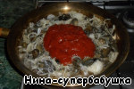 На дно таза налить немного воды, т. к. в процессе варки салат может приставать ко дну. Примерно полстакана. Выложить грибы и лук, добавить томатный соус, растительное масло, соль и черный молотый перец по вкусу. Соус можно взять и просто томатный, но тогда посильнее поперчить.