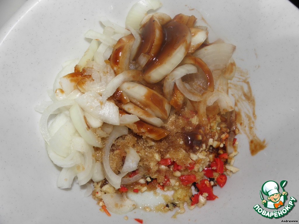 Теперь займемся маринадом: лук режем полукольцами, чеснок мелко режем, красный острый перец также мелко режем (для данного рецепта семена из острого перца вынимать не надо), корень имбиря натираем на терке, смешиваем со всеми другими ингредиентами и добавляем несколько капель вустершерского соуса.