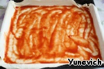 Затем начинаем начинять нашу пиццу. Первым делом смазываем корж кетчупом.
