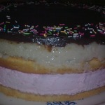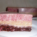 Выливаем наш вкуснейший шоколадный мусс на тортик, помещаем все это обратно в холодильник до полного застывания... Это много времени не займет. Самым "беспокойным", в этом отношении, оказался клубничный мусс. Остальные два - застывают довольно быстро. -