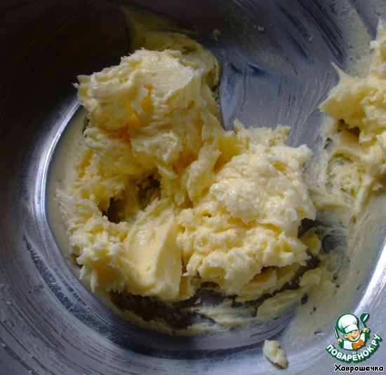 100 гр сливочного масла комнатной температуры взбить с сахаром (30 гр), ванильным сахаром или ванильной эссенцией.