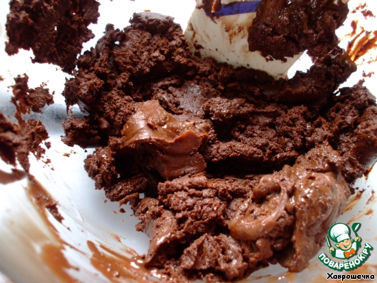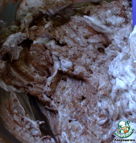 Соединить шоколадную массу со взбитым белком в три приема, перемешать вручную. Очень аккуратно, чтобы сохранились пузырьки воздуха.