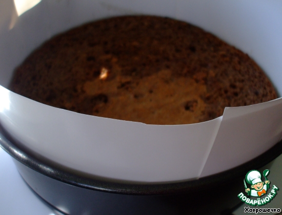 Помещаем нашу базу в разъемную форму, ту, в которой мы ее пекли, наращиваем высоту формы с помощью кулинарной ленты (ну, это все понты... Нет у меня ленты на самом деле, бумагой поплотнее воспользовалась – вот и все!).
