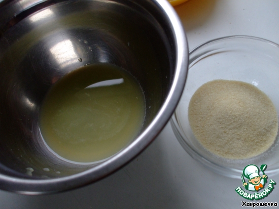 Растворяем 6 гр желатина с, примерно, 20 мл подогретого лимонного сока. Как всегда делала это с помощью моего любимого маленького венчика, который гораздо лучше справляется с размешиванием желатина в жидкостях, чем обычные ложки-вилки. Если желатин растворился не полностью – ставим миску обратно на плитку на несколько секунд, подогревая чуть-чуть и одновременно судорожно перемешивания, снимаем (перемешивать не прекращаем) и так до полного растворения желатина.