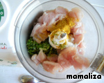 Куриное филе порезать и измельчить в блендере вместе с остальными ингредиентами для фарша. Фарш поместить в холодильник для застывания на полчаса.
