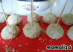 Мокрыми руками сформировать небольшие круглые котлетки, обвалять их в кунжуте и вставить деревянные шпажки.