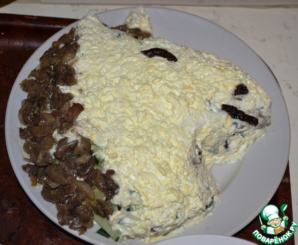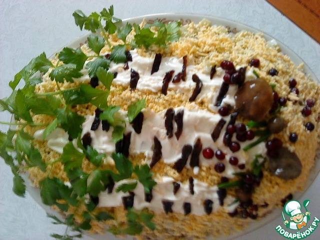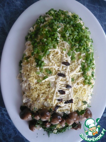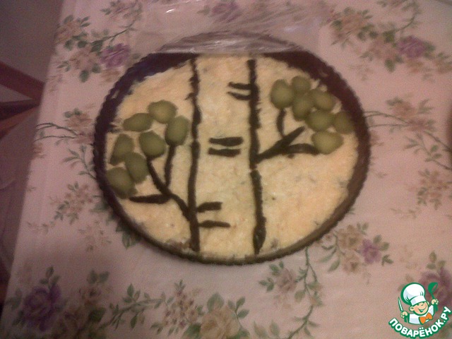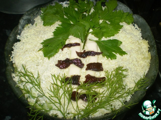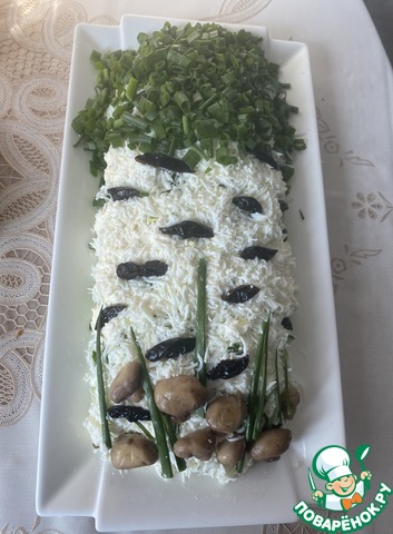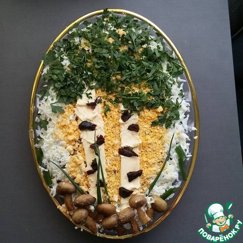 6. Желтки потереть, посыпать салатик, нарисовать майонезом стволы, крону смастерить из петрушки, полосы на березках выложить кусочками чернослива, травка у нас будет из зеленого лучка, сверху на травку выложить грибочки (можно маринованые).