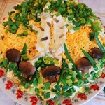3. Шампиньоны моем, режем тонкими ломтиками, жарим на подсолнечном масле. Дать остыть, выложить, смазать майонезом. Репчатый лук пережарить с грибами или использовать отдельным слоем.
