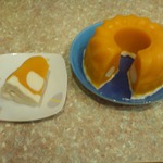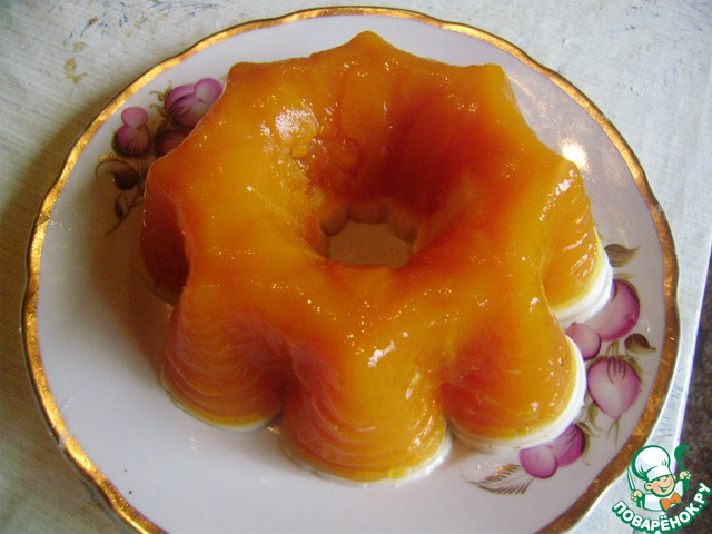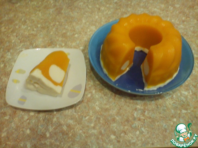 Остатки сливочно-желейной массы немного нагреваем, так как она уже успела застыть, и осторожно выливаем сверху тыквенного желе. Отправляем желе в холодильник для полного застывания, у меня на это ушло 3 часа.