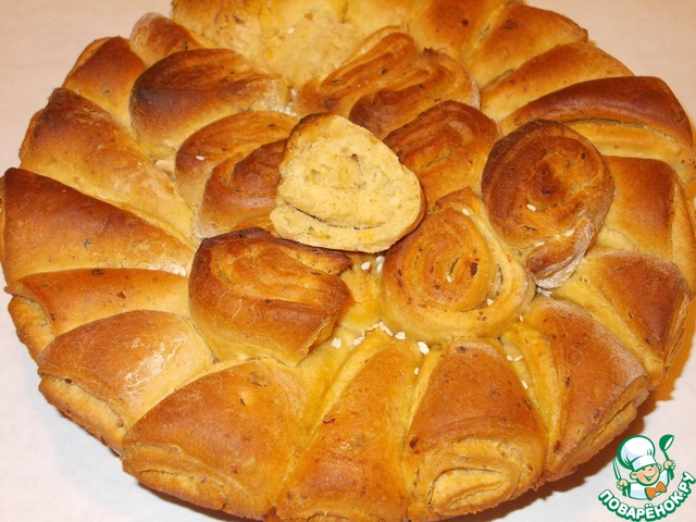 • Незаметно пролетели ещё полчаса. Девушка смазала хлеб взбитым яйцом, посыпала кунжутом. И поставила в печь (уже нагретую до 200 градусов). Через 40 минут шикарный, ароматный хлеб был готов.