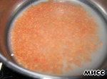 Сначала она поставила вариться чечевицу (на 80 г взятой чечевицы она взяла 160 мл воды. Для этого рецепта лучше всего подходит красная чечевица, она хорошо разваривается). Через 15 минут чечевица сварилась, Золушка потолкла её в пюре (в наше время можно использовать для этого блендер).