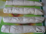 Далее в каждом рулете отрезала по кусочку с концов (3-4 см). А оставшиеся рулеты нарезала треугольниками на равные 4 части.