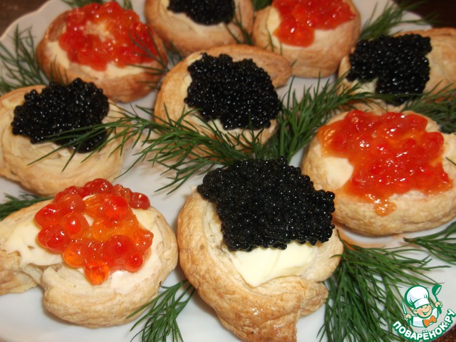 А можно салатик вперемежку с икрой, как в этом. Украсить можно розой из огурца или помидора, помидорками черри... да чем угодно. Как сделать розу из огурца, можно посмотреть здесь: https://www.povareno k.ru/recipes/show/40 373/
