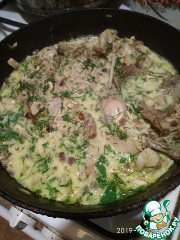 Переложить в кастрюлю, залить водой или бульоном, чтобы куски кролика были ею только-только покрыты. Досолить, если требуется. Поставить на маленький огонь тушиться.