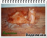Из мяса - у меня было куриное филе (4 шт). Филешки разрезаем вдоль пополам, отбиваем (чтобы она была потоньше, потом легче будет делать цветок) и маринуем. Я мариновала в соевом соусе где-то около часа. Можно замариновать в майонезе, в кефире, просто посолить и поперчить. Тут, как вам угодно.