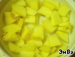 Айву, не очищая от кожуры, нарезать тонкими дольками, каждую дольку разрезать на 3-4 части. Залить кипятком и оставить, пока вода не остынет.