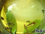 Приготовить маринад: в кастрюлю всыпать сахар, соль, налить уксус, сок лимона и апельсина, положить лавровый лист и пряности, развести водой, поставить на огонь и довести до кипения, иногда помешивая.