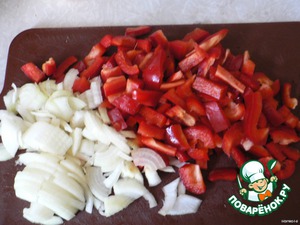 Нарежьте перец короткими полосками, а лук - четвертинками колечек.