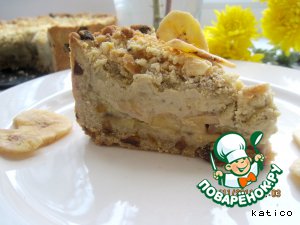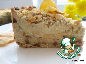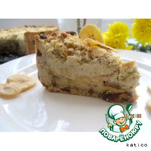 Очень банановый пирог: песочный корж с ароматными вялеными бананами, прослойка из бананов и яблока, сверху - густой банановый крем, а еще выше - хрустящая посыпка из банановых чипсов и белого шоколада. Вкус очень банановый, нежный и насыщенный. Любители бананов, заходите!