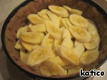 Яблоки очистить от сердцевины и кожуры, тонко порезать, выложить на тесто, банан очистить, тоже тонко порезать и выложить на яблоки. Поставить в предварительно разогретую духовку 180 град на 10-15 мин.