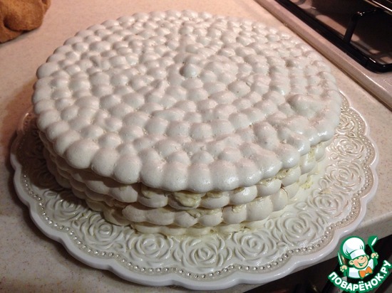 Наполнить массой безе кондитерский шприц и выдавливая массу по спирали, заполнить ею начерченный круг.