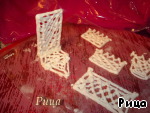1 -ое, отделяем белок от желтка и осторожно взбиваем венчиком, постепенно подсыпая просеянную сахарную пудру, пока она не примет белую однородную массу с не очень выраженными пиками. Можно взбивать и миксером, но только на самых минимальных оборотах, чтобы масса не насыщалась воздухом, который не даст тонкой линии при нанесении рисунка. Так что наберитесь терпения в этом процессе. Готовую глазурь необходимо укрыть плeнкой или, даже, двойной, сверху положить влажное полотенце, это убережeт нашу глазурь от высыхания в процессе работы. Глазурь в корнетик наполняем до половины, так она лучше отсаживается на рисунок. По мере расходования наполняем вновь. Когда у меня остаeтся какое-то количество лишней глазури, я уже сама от руки рисую какие-то маленькие узоры на шаблоне (у меня бабочка видна на фото) и использую таким образом все остатки. Они всегда пригодятся в будущем для украшения тортов или кексов. Сама работа с рисунками айсингом много времени не занимает - всего около 30 минут. Сушка изделий - это то, на что уходят сутки.. И если даже хорошо просушится та или иная часть, а какая-нибудь может повредиться при снятии уже готового рисунка с айсингом и при этом не очень приятным факте приходится повторять всe заново - вот это самое главное, что необходимо иметь ввиду, если Вы пожелаете делать Колыбельку или какое другое объeмное изделие к определeнному сроку, то лучше этой работой заняться за неделю до торжества, чтобы иметь запас времени на случай поломки деталек. Конечно, здорово, если всe сразу получится как следует.