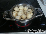Шампиньоны отварить 10-15 минут, остудить и отжать от излишков воды.