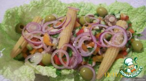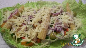 На смесь положила маринованные кукурузные початочки (ох, и вкусные они, помощница прям не удержалась и два початка скушала).