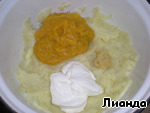 Пока тыква с мясом запекаются, нужно сварить картофель. Воду слить и картофель истолочь в пюре. В картофельное пюре добавить тыквенное пюре, сметану и натертый на мелкой терке имбирь.